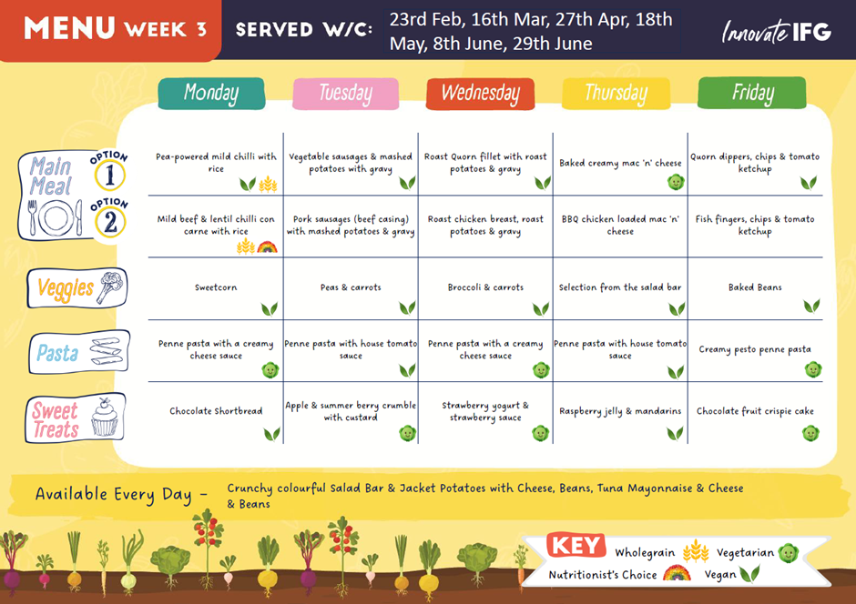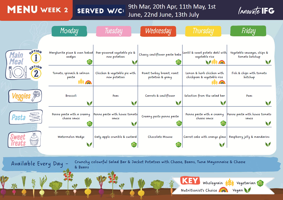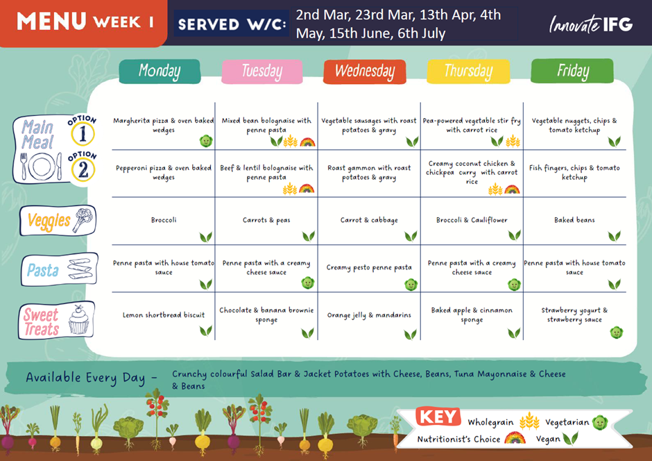 Find out what your children will be enjoying at dinner time in the Menus below from Innovate.  These menus are also displayed on the app ready for your pre-order.  The menus below are available until Friday 27th March 2026.